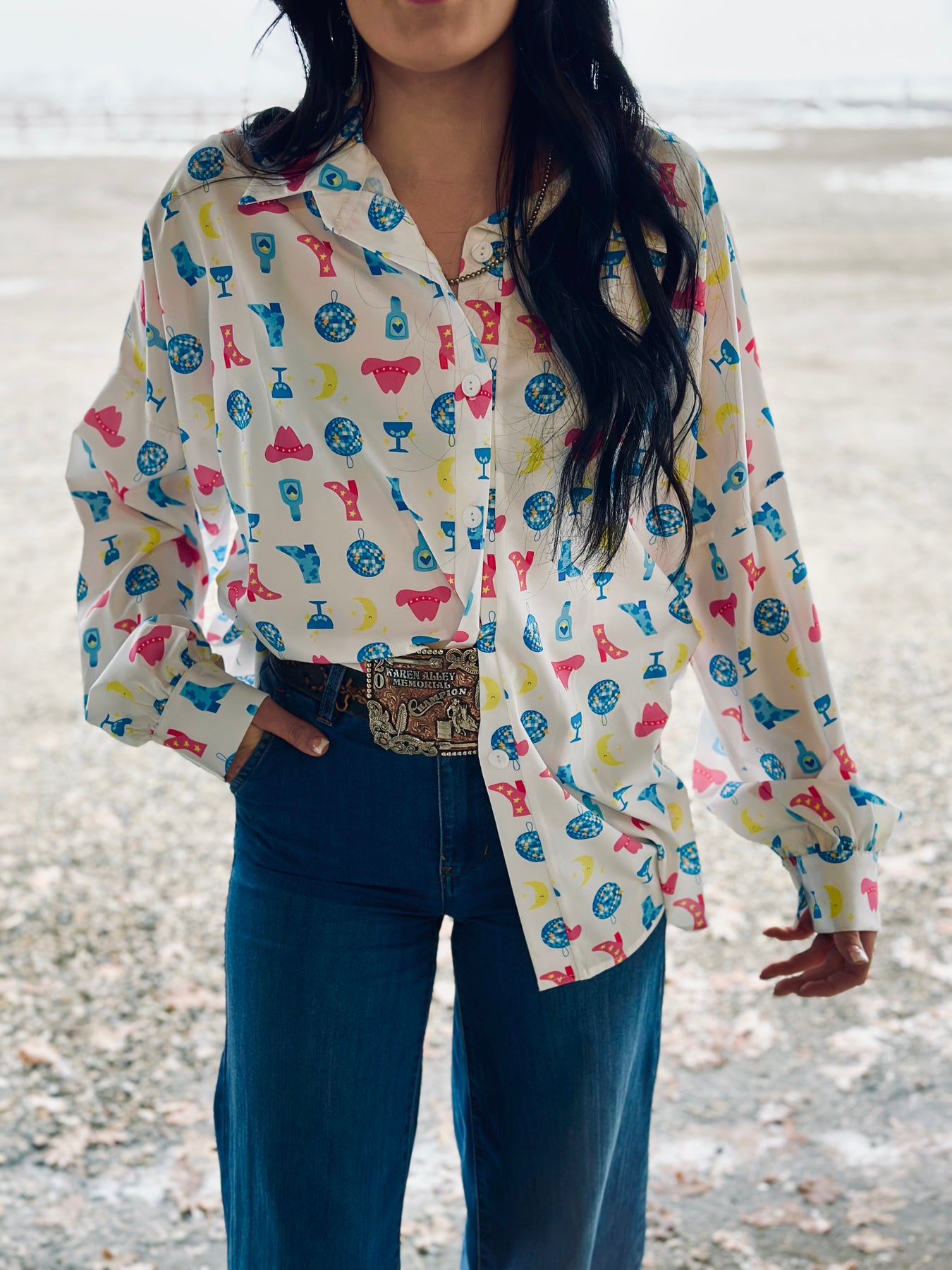 Super cute little button down. Has vibrant colors and designs. The disco ball and boots make a statement for your day out. Can dress up or dress down. 95% polyester, true to size.