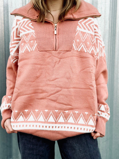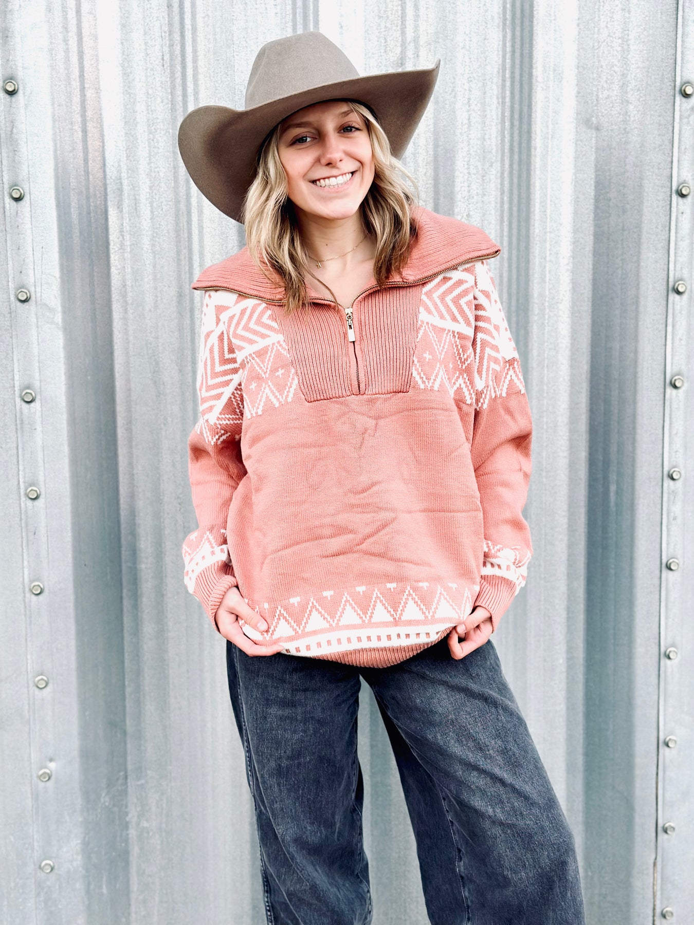 Wrap yourself in comfort and style with the Bless Your Heart Pullover! This soft, thick material features a collared western design with beautiful white aztec patterns and a stunning gold zipper. In a delicate shade of pink, this pullover will not only keep you warm, but will also add a touch of elegance to your outfit. A must-have for any fashionista!