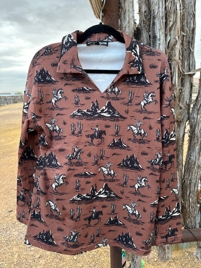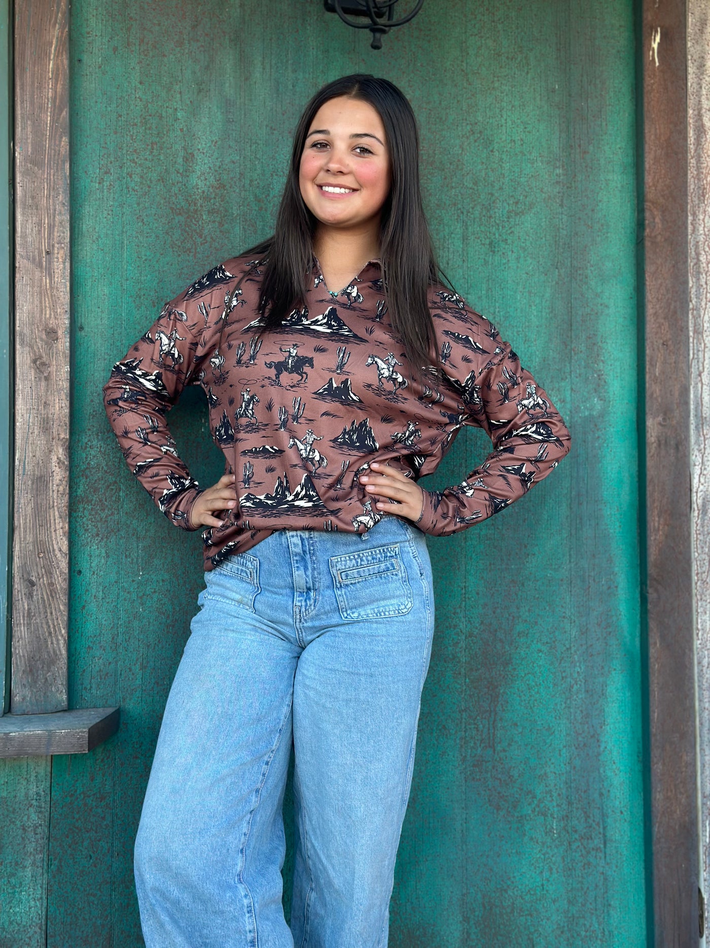 Saddle up with the Burn the Breeze Half Zip! This cowboy-inspired pullover features a bold Desert graphic, half zip design, and a classic brown and black color scheme. True to size fit ensures maximum comfort for all your adventures. Giddy up!