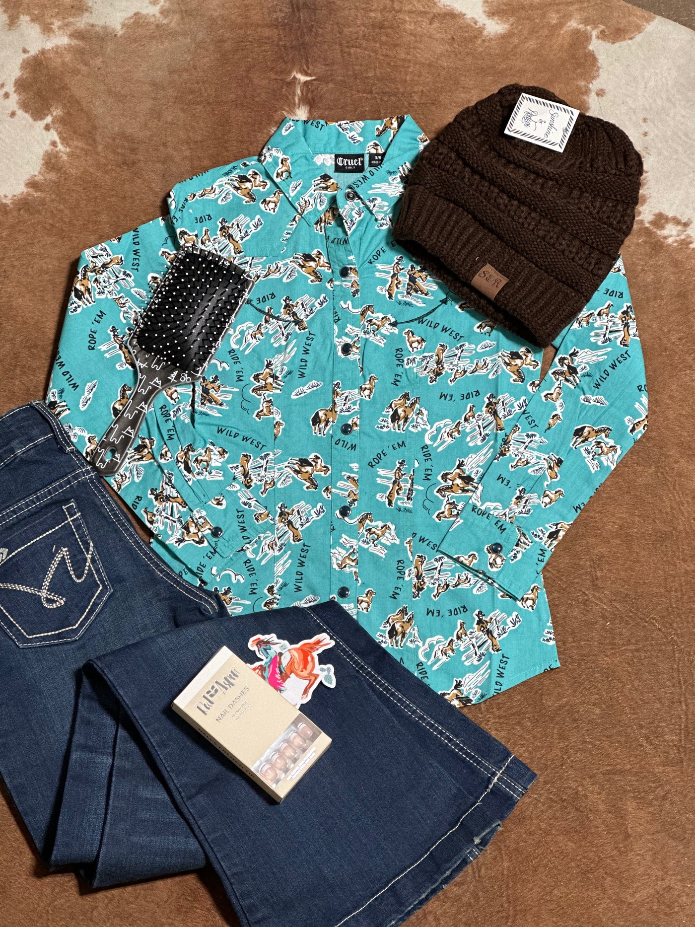 Keep your little one looking wild with this stylish Girls Wild West Button Down. The classic button down design and bright colors make this piece a perfect choice for any occasion. Crafted from comfortable fabric and detailed with pearl buttons, this timeless piece will stay looking great for years to come.