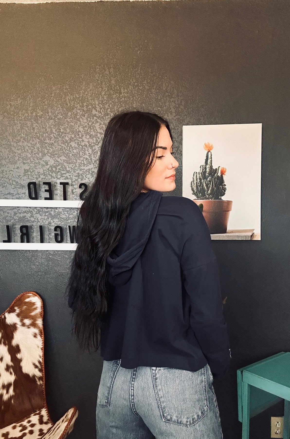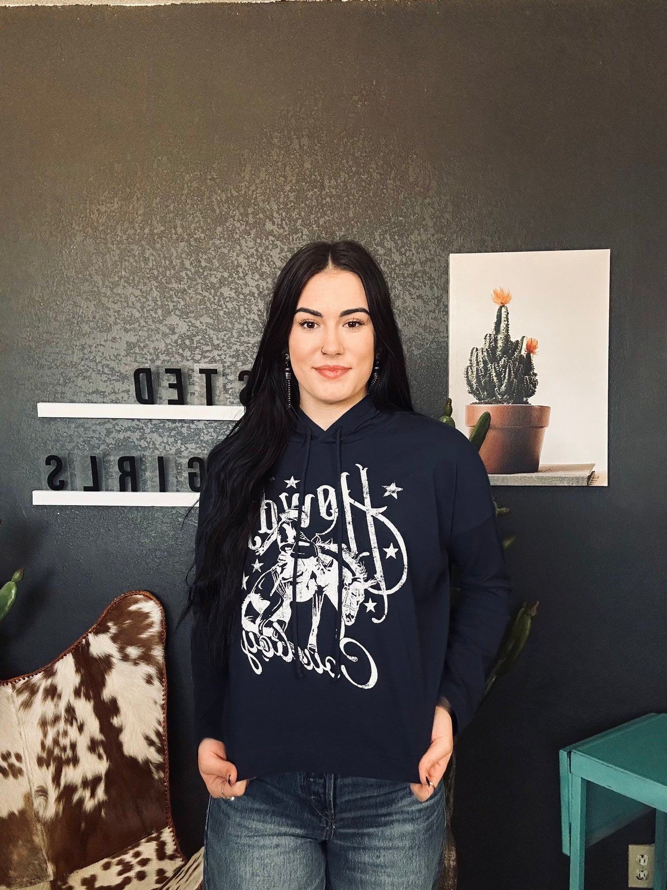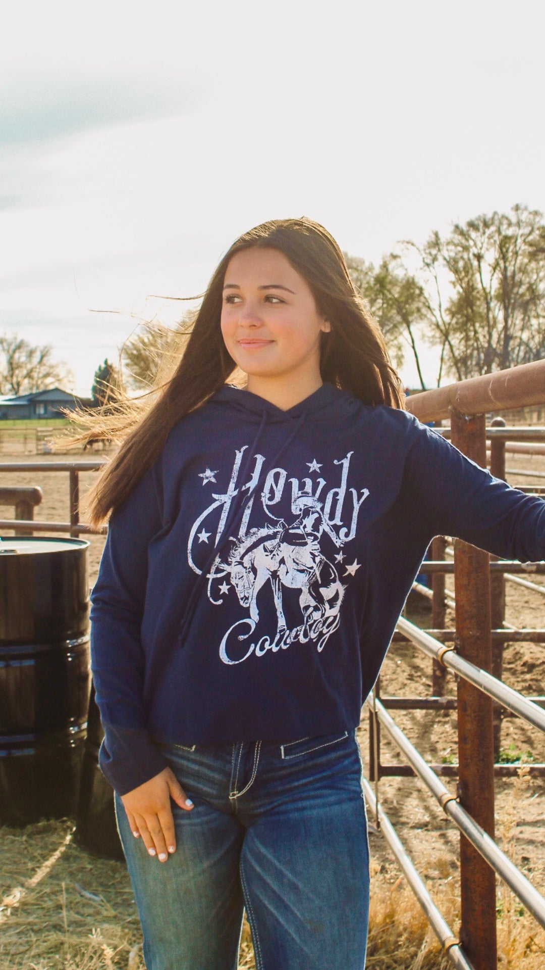 Get ready to saddle up in style with our Howdy Cowboy Graphic Hooded Long Sleeve! This adorable top features a navy blue hue and cute bronc design, perfect for any western enthusiast. Made from 100% cotton, it's also cozy and includes strings on the hood for extra functionality. Grab yours today and add some western flair to your wardrobe!