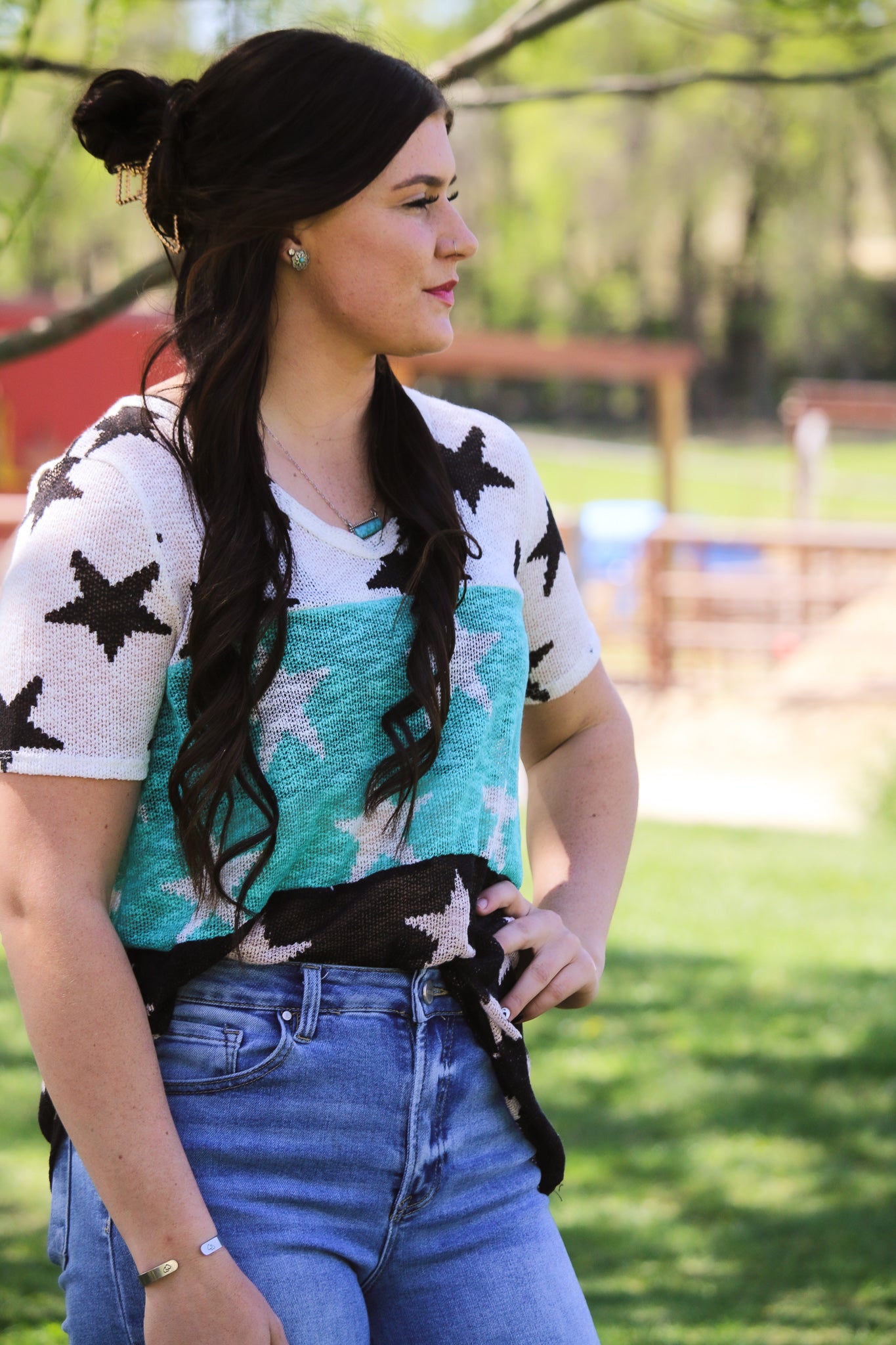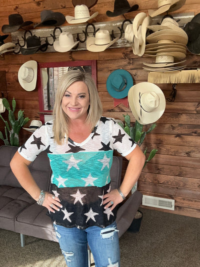 Shine bright like a minty star in this playful top! The star knit design pops in mint, black, and white for a fun contrast. Stay cool and stylish in this quirky top.