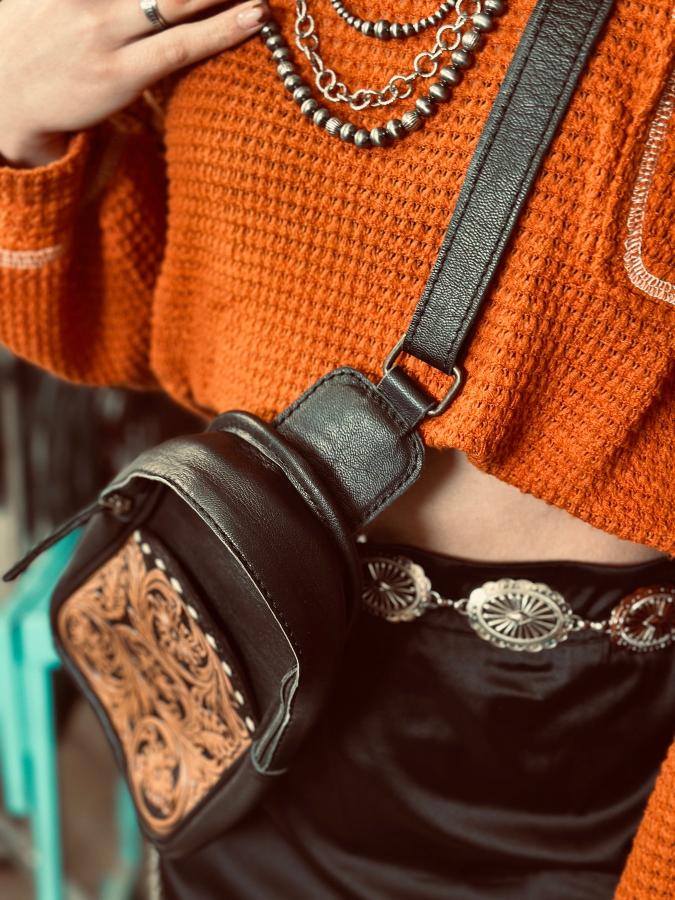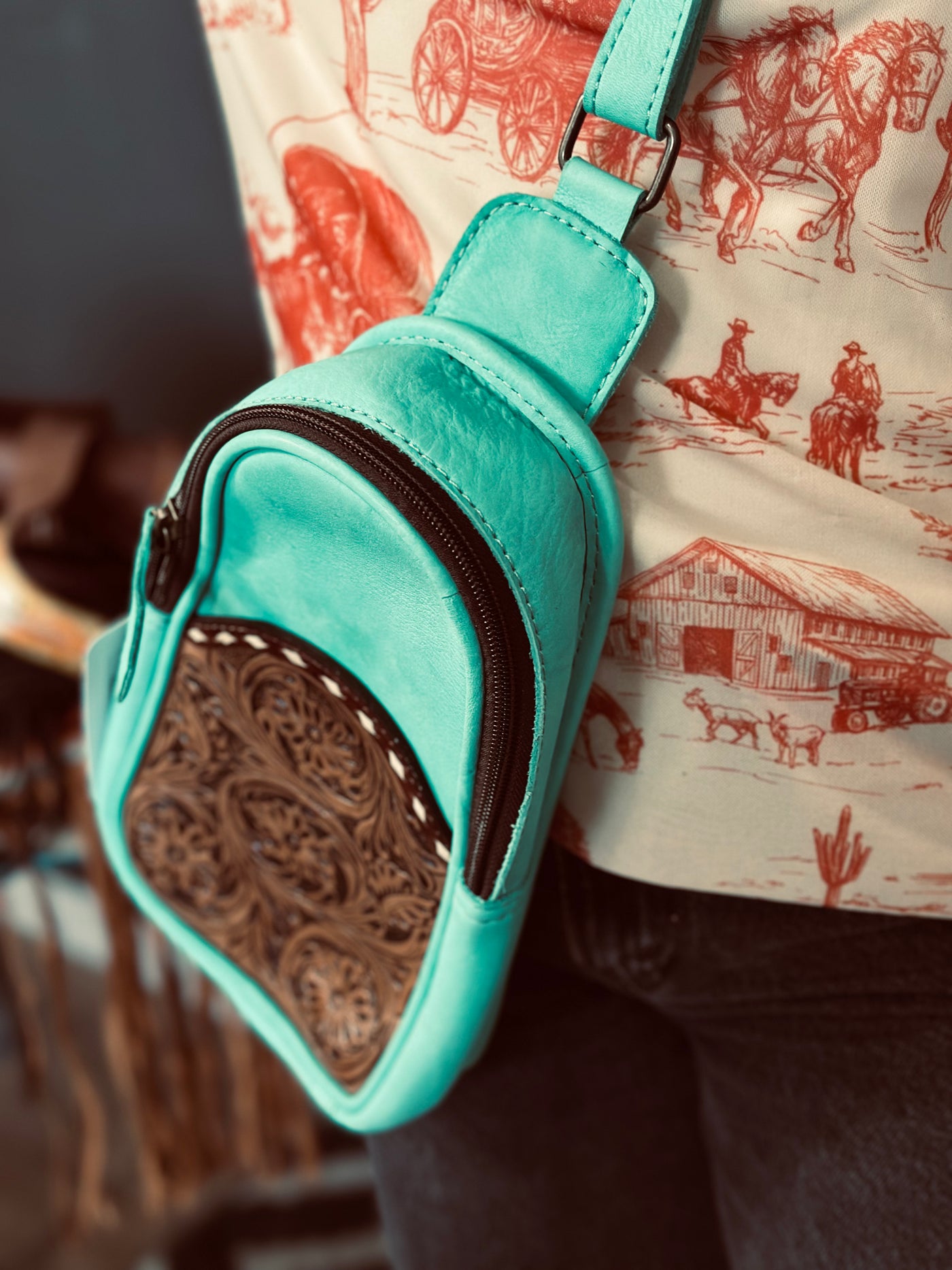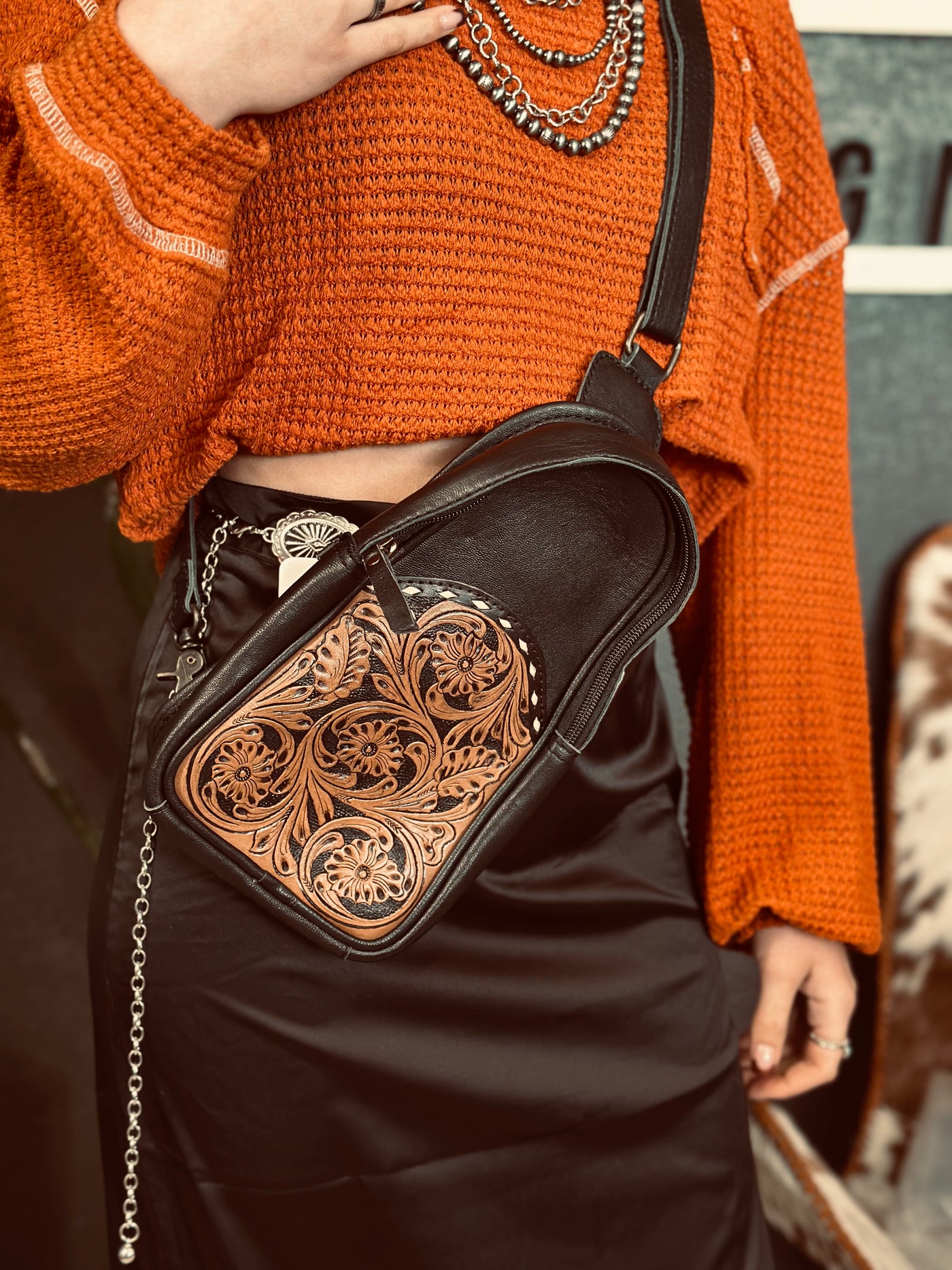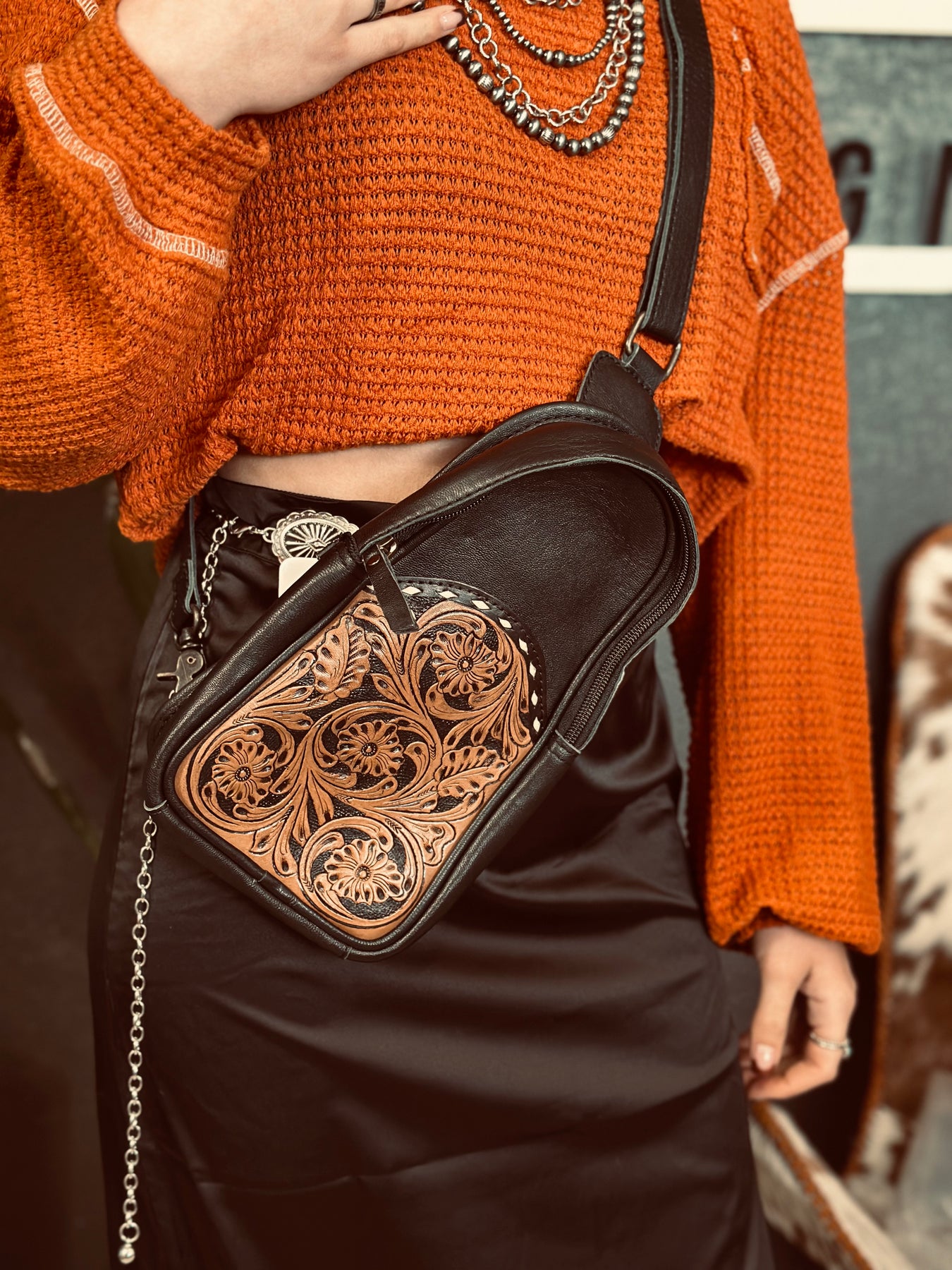 Upgrade your accessory game with our stylish Over The Shoulder Leather Clutch Bag! Featuring two bold colors and intricate leather tooling, this bag is the perfect combination of cute and rustic. The buckstitch details add a touch of fun to any outfit. Elevate your style and make a statement with this must-have bag!