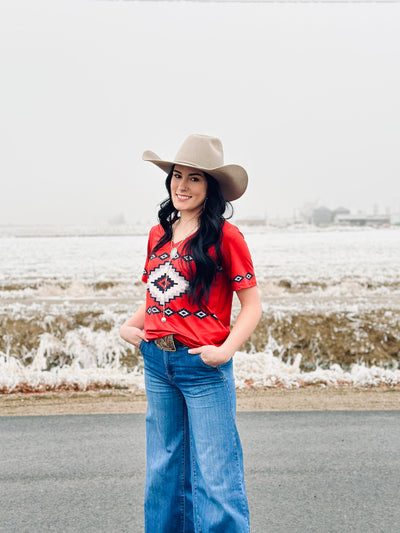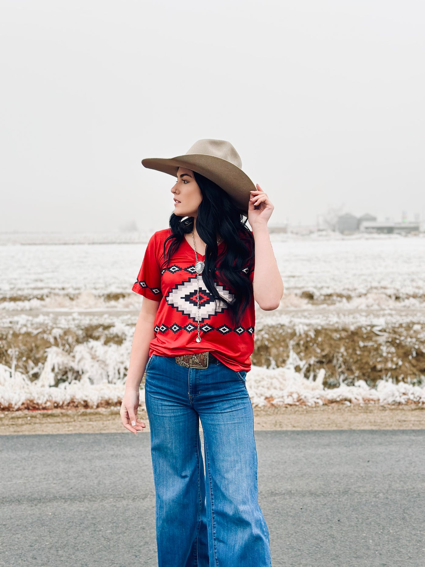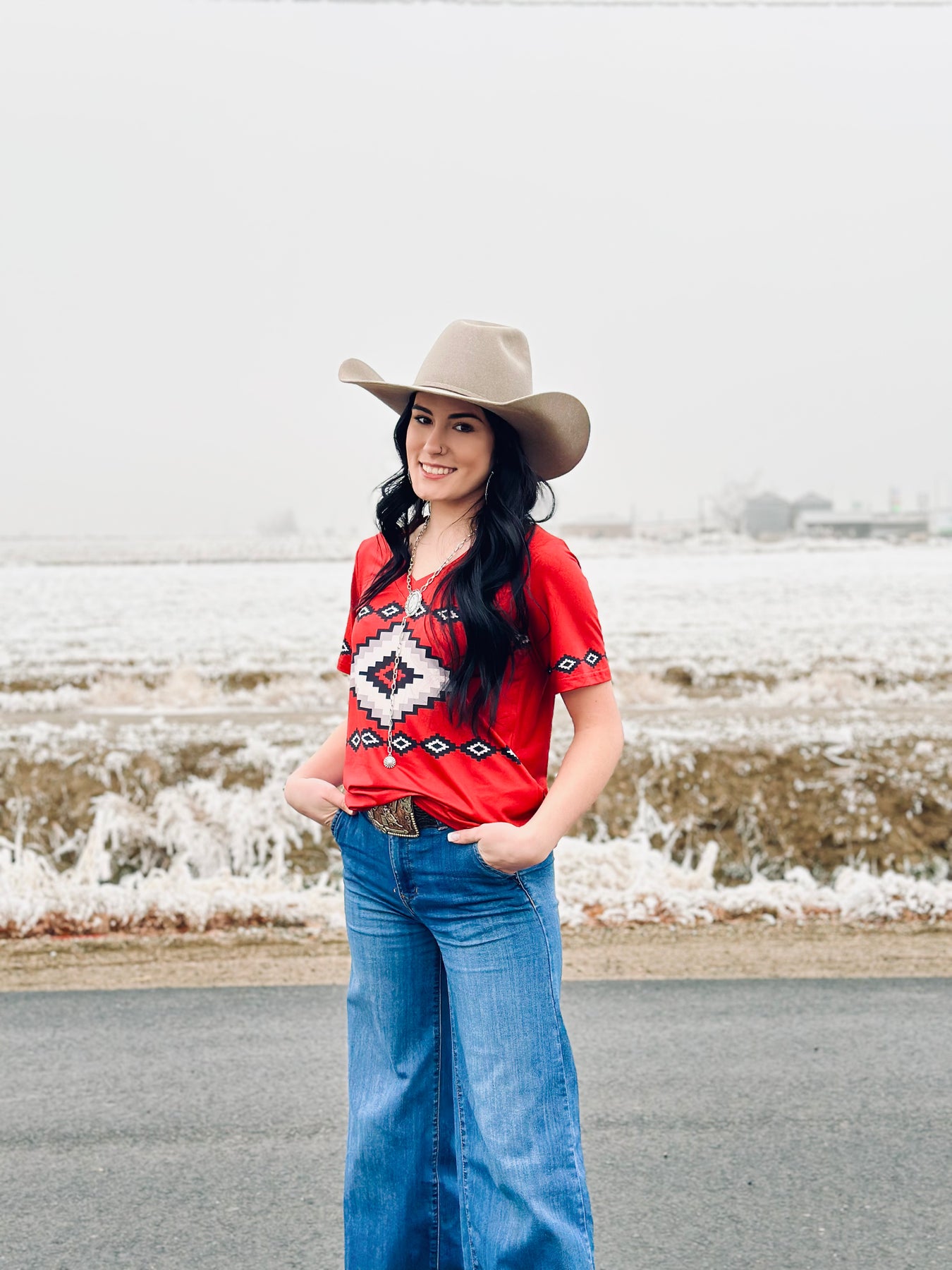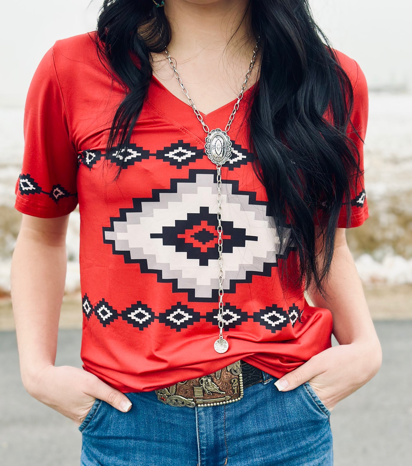 Elevate your wardrobe with our Rolling Like Reba top! Featuring a striking red aztec print, this top is both soft and stretchy for ultimate comfort. The v-neck design adds a touch of sophistication. Made with 94% polyester, experience luxury with every wear.